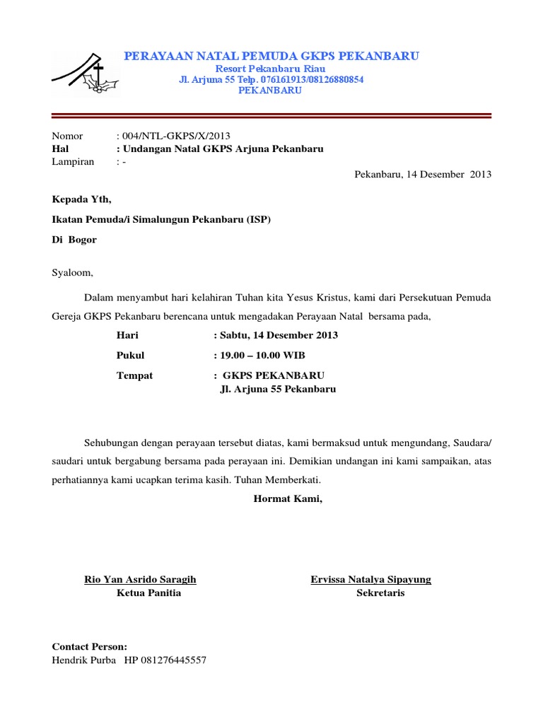 Berikut kami berikan contoh surat undangan resmi yang bisa dijadikan referensi dalam pembuatannya. Di salam sejahtera dalam kasih tuhan. Pernahkah anda mendapatkan surat undangan yang resmi yang dikirimkan dari lembaga atau instansi tertentu? 73 mengundang bpk/ibu/sdr/i sekalian untuk dapat hadir dalam acara ibadah perayaan natal pada Semua persiapan tersebut akan dilakukan oleh panitia natal yang terpilih di tempat.